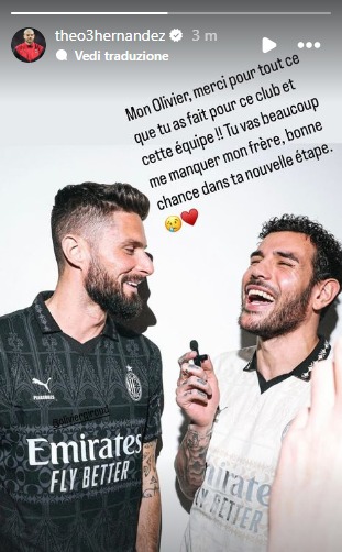 Theo Hernandez ha pubblicato una storia su Instagram per salutare Olivier Giroud che contro Torino e Salernitana giocherà le sue ultime due partite con la maglia del Milan. Il terzino ha scritto: "Grazie per tutto quello che hai fatto per il club e per questa squadra. Ci mancherai moltissimo fratello, buona fortuna per la tua nuova avventura".