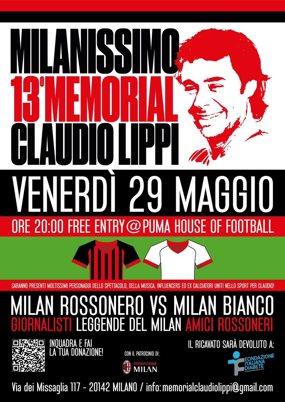 Venerdì 29 maggio alle 20.00 al Puma, House of Football andrà in scena la 13^ edizione del "Memorial Claudio Lippi” che ricorda il collega di Milan Channel scomparso in un tragico incidente stradale nel marzo 2013. In campo si sfideranno Milan rossonero contro Milan bianco e saranno presenti moltissimi personaggi dello sport, della musica, del giornalismo, influencer ed ex calciatori. Il ricavato della donazioni sarà devoluto alla Fondazione Italiana Diabete. L'ingresso sarà libero per chiunque vorrà partecipare e assistere dagli spalti a questa bella serata di beneficenza.