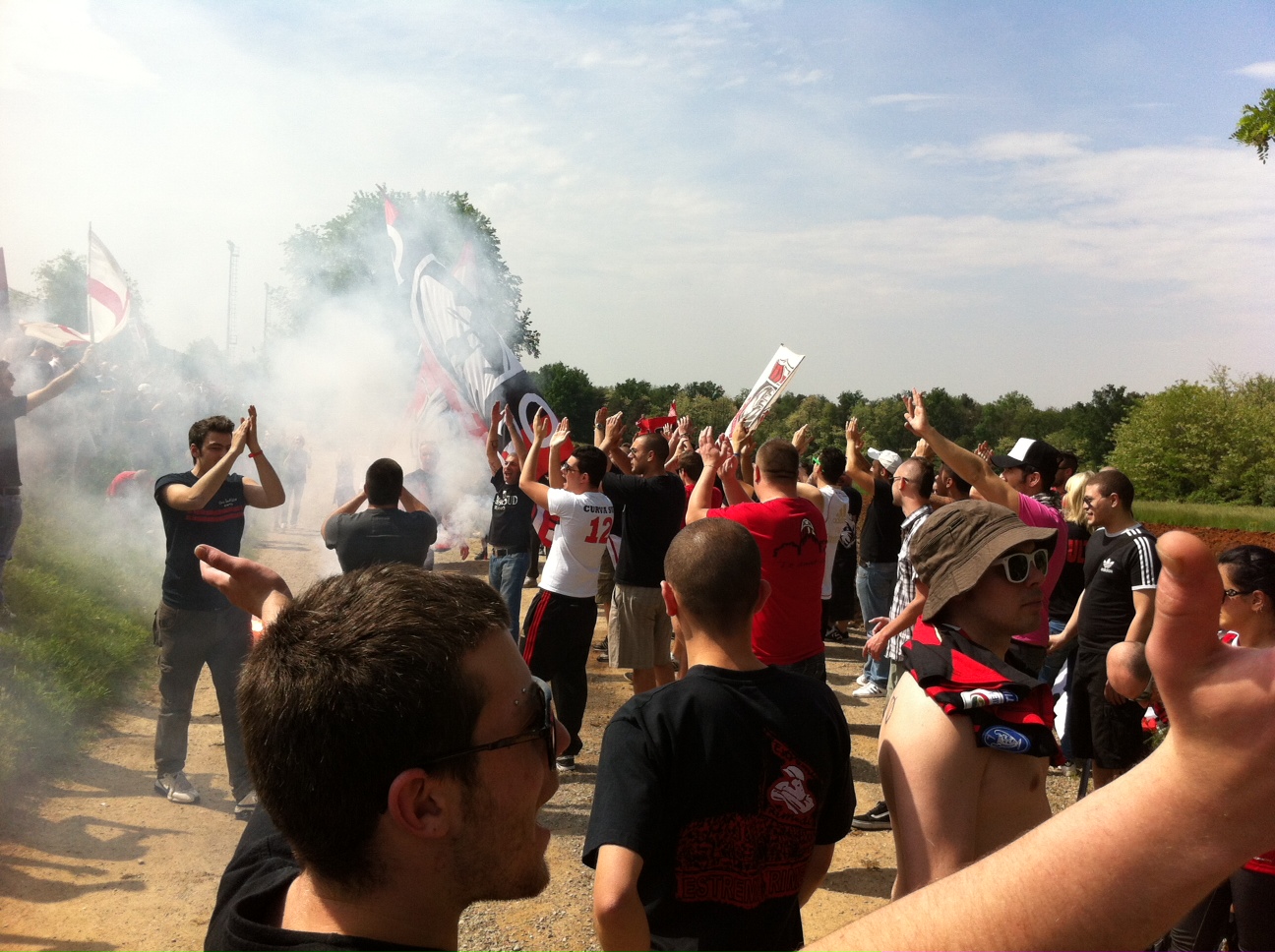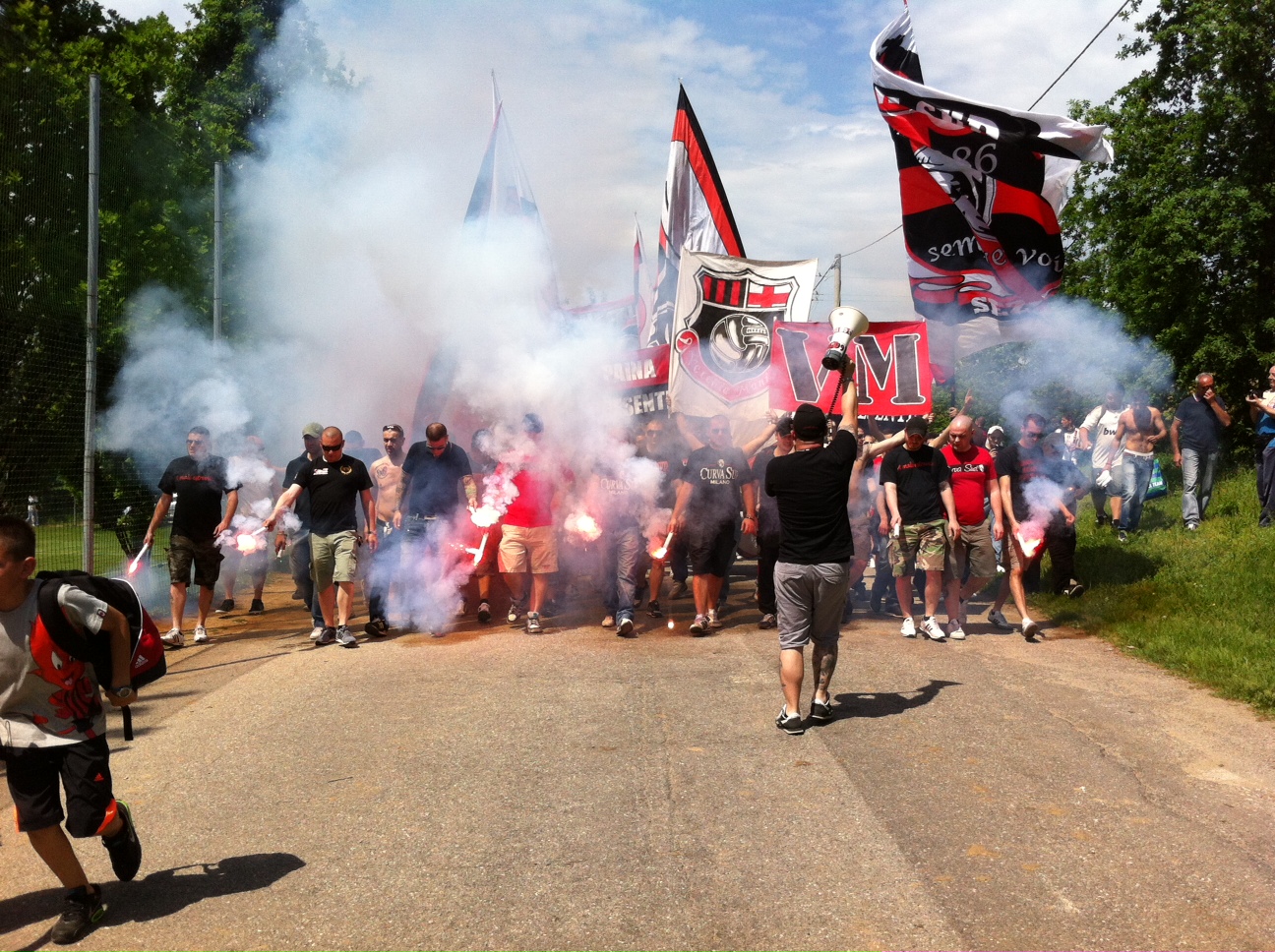 12.45 - Finisce qui il raduno a Milanello della Curva Sud. Tanto entusiamo e grande partecipazione: i sostenitori rossoneri hanno salutato così la squadra, prima dell'ultimo appuntamento di domani a San Siro.