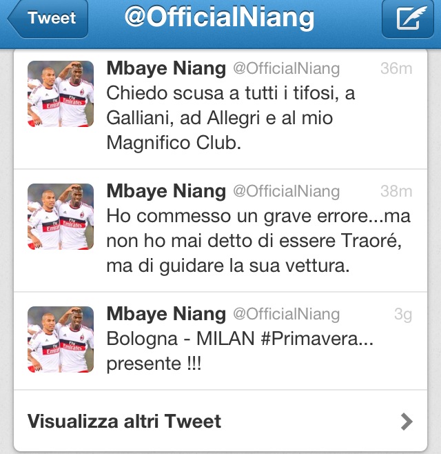 "Ho commesso un grave errore...ma non ho mai detto di essere Traoré, ma di guidare la sua vettura. Chiedo scusa a tutti i tifosi, a Galliani, ad Allegri e al mio Magnifico Club". Così il nuovo acquisto del Milan M'Baye Niang scrive sul suo profilo "Twitter" ufficiale, in seguito allo spiacevole episodio successo ieri.