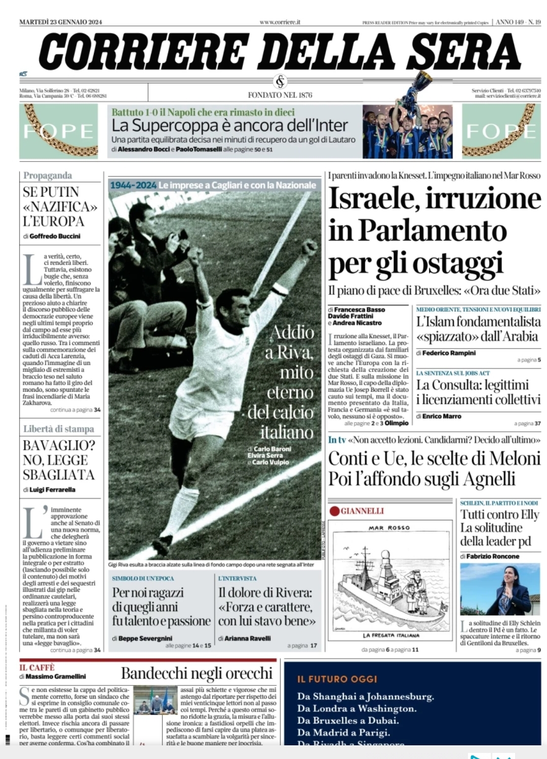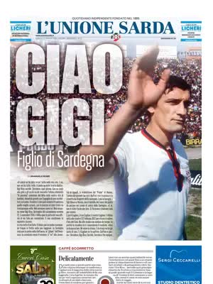 Anche i giornali generalisti salutano Gigi Riva. Il Corriere della Sera apre scrivendo: "Addio a Riva, mito eterno del calcio italiano". La Repubblica segue a ruota: "Addio Gigi Riva, rombo di tuono". La Stampa invece scrive: "Un Rombo nel cielo". L'Unione Sarda a tutta pagina scrive semplicemente: "Ciao Gigi".