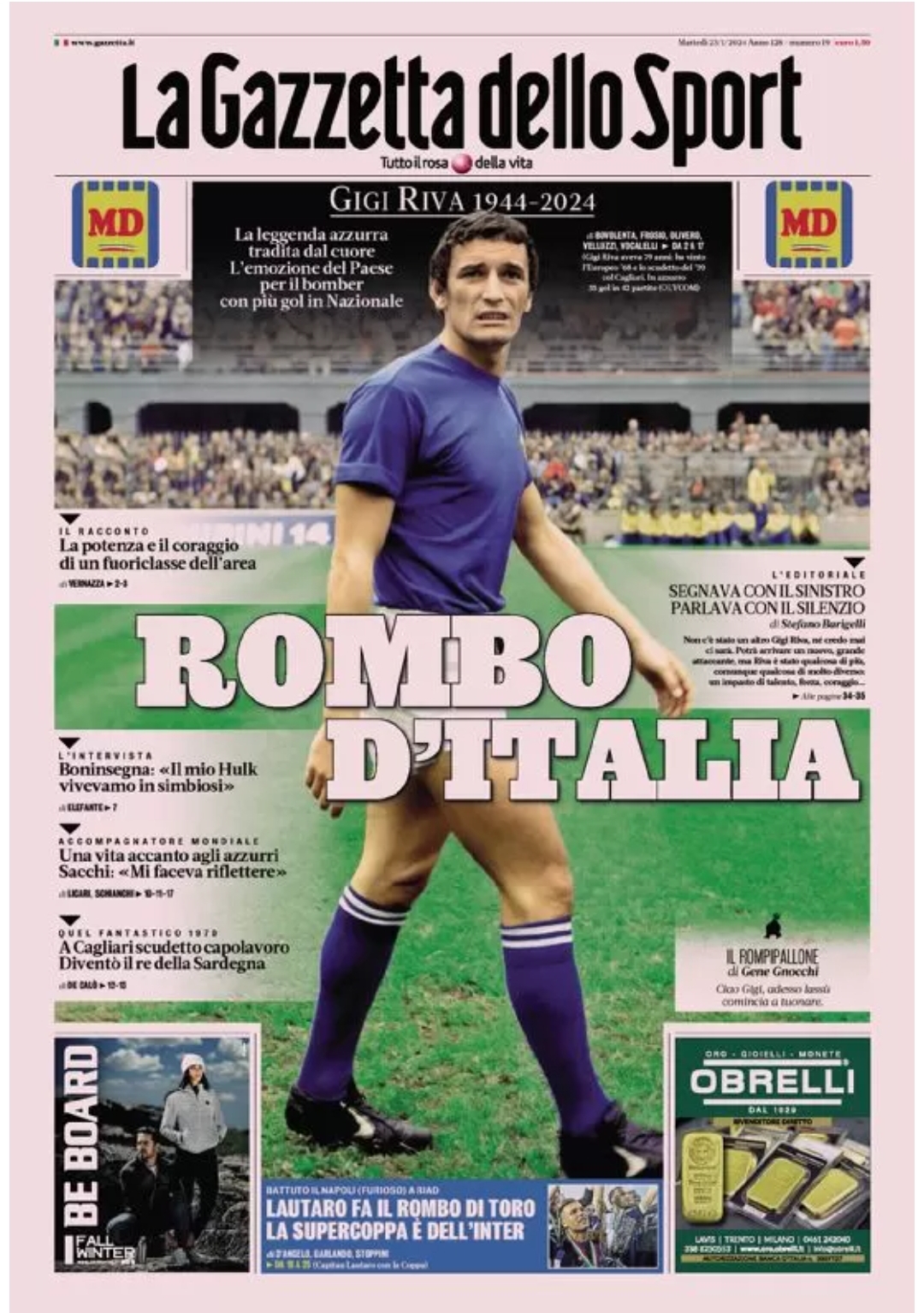 Addio alla leggenda Rombo di Tuono. Le prime pagine di oggi dedicate a Gigi Riva