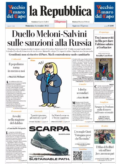 La Repubblica di questa mattina trova spazio in prima pagina anche per la giornata di campionato titolando: "Il Milan di RedBird vola sull'Inter". Il riferimento è chiaramente al derby vinto dai rossoneri per 3-2 con doppietta di Leao e rete di Giroud. Una vittoria che permette a Pioli di tornare in vetta in compagnia del Napoli
