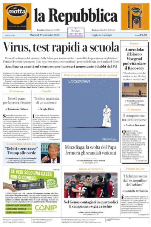 C’è spazio anche il calcio sulla prima pagina dell’edizione odierna del quotidiano La Repubblica, che titola: "Nel Genoa contagiati in quattordici. Il campionato è già a rischio". La situazione è complicata. Non a caso, il noto giornale parla di "allarme per la Serie A".