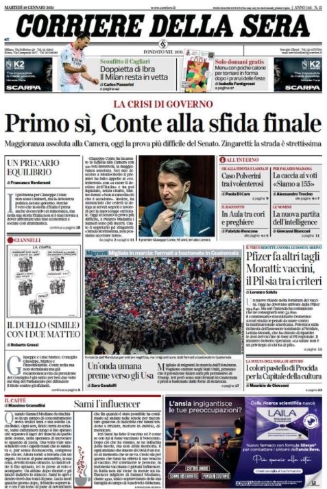 Si para anche di calcio, o meglio, della vittoria di ieri della squadra di Pioli, sulla prima pagina dell’edizione odierna del Corriere della Sera. "Doppietta di Ibra, il Milan resta in vetta", titola il noto quotidiano, che poi aggiunge sempre in taglio alto: "Sconfitto il Cagliari".