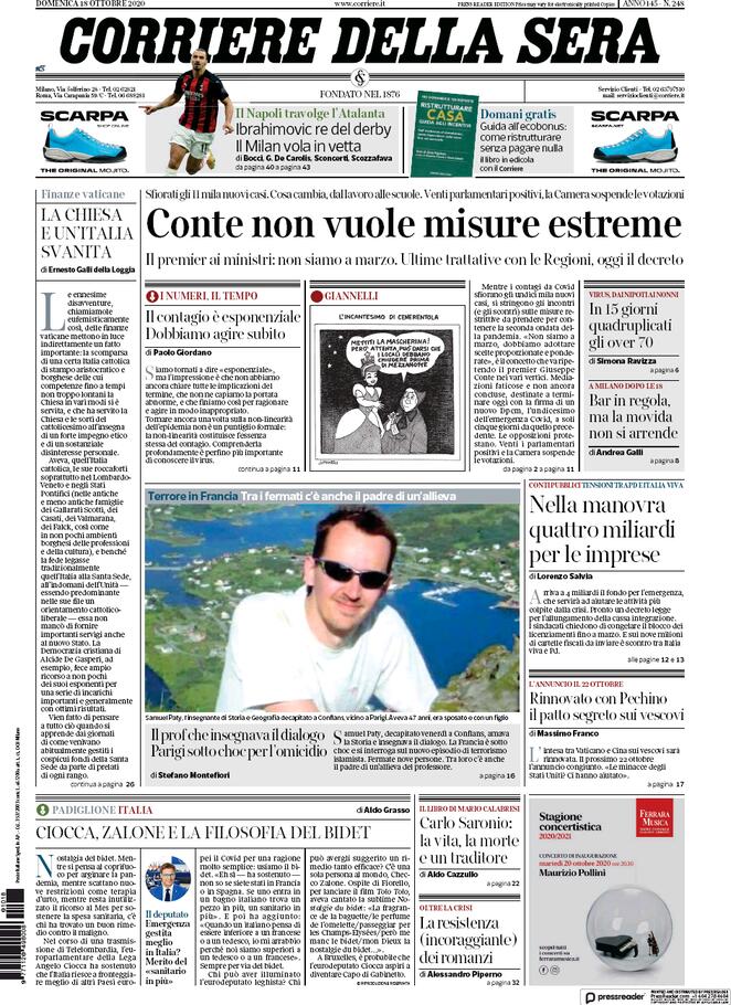 Si parla anche di calcio, o meglio, della stracittadina di Milano sulla prima pagina dell’edizione odierna del Corriere della Sera. "Ibrahimovic re del derby", titola il noto quotidiano, che poi aggiunge, sempre in taglio alto: "Il Milan vola in vetta".
