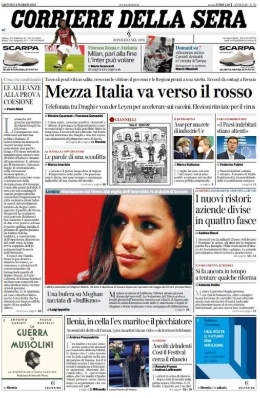 Si parla anche di calcio, dopo il turno infrasettimanale di ieri, sulla prima pagina dell’edizione odierna del Corriere della Sera. "Milan, pari alla fine", titola il quotidiano milanese, che poi aggiunge in taglio alto: "L’Inter può volare". Vincendo questa sera a Parma, infatti, la squadra di Conte allungherebbe a +6 sui rossoneri, mettendo una seria ipoteca sullo Scudetto.