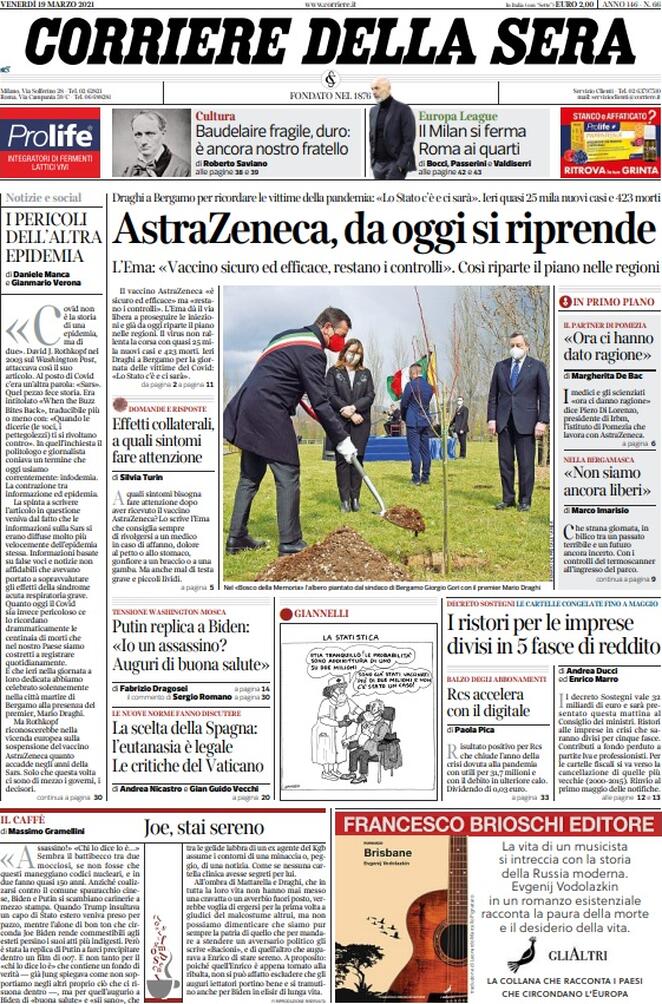 L'edizione odierna del Corriere dello Sport si sofferma in prima pagina sul turno di Europa League andato in scena ieri, con le italiane protagoniste, e titola: "Il Milan si ferma. Roma ai quarti". I rossoneri vengono eliminati in casa dal Manchester United con un gol di Paul Pogba (1-0). Negato un rigore a Zlatan Ibrahimovic. Giallorossi vincenti, invece, in trasferta contro lo Shakhtar Donetsk per 2-1: doppietta di Borja Mayoral.