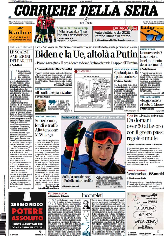 Il Corriere della Sera stamani, in prima pagina, si occupa della corsa al vertice della classifica e in particolare del sorpasso avvenuto ieri da parte del Milan sull’Inter. Ecco il titolo proposto dal quotidiano oggi in edicola: “Il Milan scavalca l’Inter. Pari tra Juventus e Atalanta”.