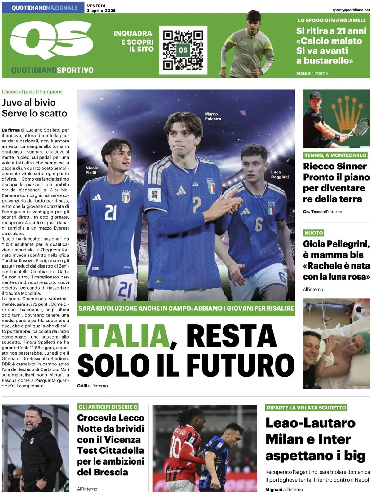 Giusto il QS questa mattina parla di Milan in maniera concreta e titola così in taglio basso: "Leao-Lautaro, Milan e Inter aspettano i big. Recuperato l'argentino: sarà titolare domenica. Il portoghese tenta il rientro con il Napoli"