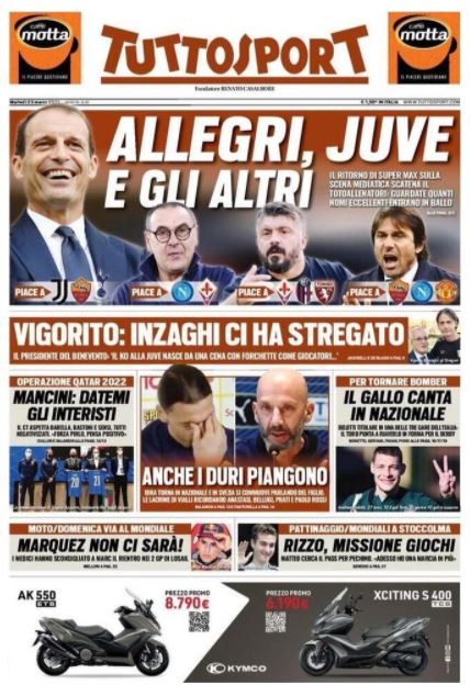 "Anche i duri piangono", titola il quotidiano Tuttosport in prima pagina. "Ibra - si legge - torna in nazionale e in Svezia si commuove parlando del figlio". Non solo: anche Gianluca Vialli, attuale capo delegazione della Nazionale azzurra, ha pianto in conferenza stampa "ricordando Anastasi, Bellugi, Prati e Paolo Rossi", scrive il noto giornale sportivo torinese.