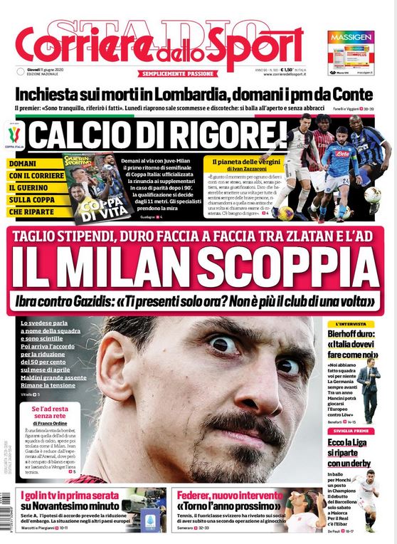 L’edizione odierna del Corriere dello Sport dedica l’apertura alla società milanista dopo il "duro faccia a faccia" tra Ibrahimovic e l’a.d. Gazidis, che ieri si è presentato a Milanello per comunicare ai giocatori la decisione della proprietà in merito al taglio degli stipendi. "Il Milan scoppia", titola il noto quotidiano sportivo della Capitale, che poi, sempre in prima pagina, riporta le dichiarazioni che il fuoriclasse svedese avrebbe rivolto al manager sudafricano: "Ti presenti solo ora? Non è più il club di una volta".