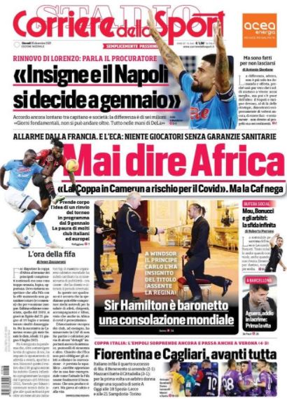 "Mai dire Africa", titola il Corriere dello Sport in prima pagina, soffermandosi su uno degli argomenti più caldi del momento: lo svolgimento della prossima edizione della Coppa d’Africa. "Allarme dalla Francia", scrive il quotidiano romano, che poi aggiunge: "L’Eca: niente giocatori senza garanzie sanitarie. Prende corpo l’idea di un rinvio del torneo in programma dal 9 gennaio. La paura di molti club italiani ed europei".
