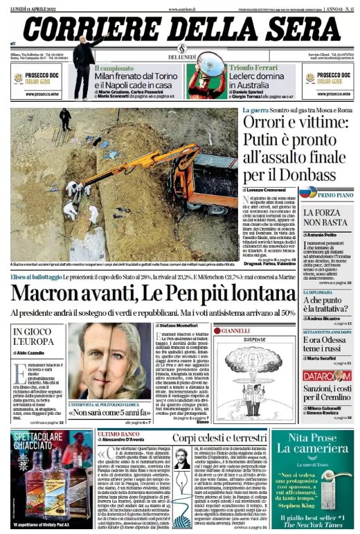 Colpi di scena in Serie A nella 32esima giornata di campionato. Il Corriere della Sera propone questo titolo nel taglio alto della prima pagina di oggi: "Milan frenato dal Torino e il Napoli cade in casa". Diavolo timido contro i granata, Maignan evita guai peggiori, ma l'Inter è in agguato. Rossoneri in difficoltà, neutralizzati bene dalla squadra di Juric, vanno incontro ad un altro pari senza gol. Davanti troppo solo Giroud, inconcludente Leao. Intanto la Fiorentina è spietata ed il Napoli si spezza. Viola efficaci e pratici, Gonzalez decisivo. Non bastano i gol di Mertens e Osimhen. Spalletti: "Difficile recuperare in poche gare".