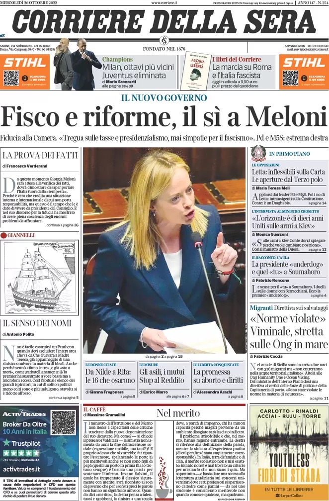 Il Corriere della Sera, questa mattina in edicola, si sofferma in apertura sui risultati delle squadre italiane ieri sera in Champions League. Ecco il titolo proposto dal quotidiano in prima pagina: “Milan, ottavi più vicini. Juventus eliminata”. 4-0 del Milan alla Dinamo Zagabria; 4-3 subìto invece dalla Juve contro il Benfica.