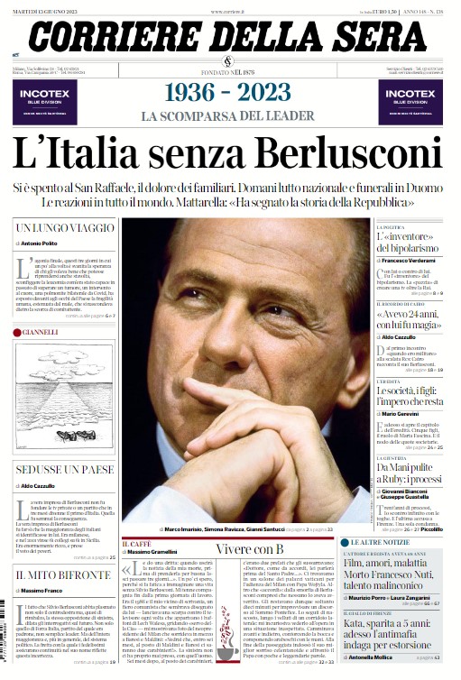 “L’Italia senza Berlusconi”, titola in prima pagina il Corriere della Sera. Un titolo dal forte impatto dopo la scomparsa di un uomo che segnato la storia del nostro paese, tra sport, politica e lavoro. L'ex presidente del Milan se n’è andato ieri, domani a Milano si terranno i funerali e sarà proclamata giornata di lutto nazionale.