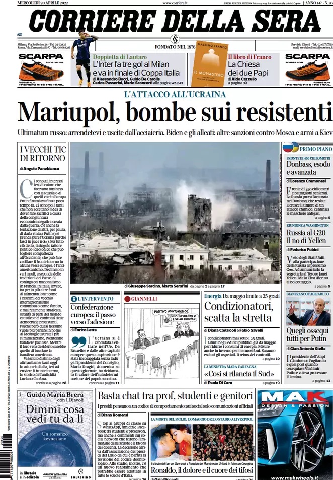 Il Corriere della Sera, questa mattina in edicola, si focalizza in prima pagina sul successo ottenuto dall’Inter contro il Milan, ieri, che ha permesso ai nerazzurri di passare alla finale di Coppa Italia 2021-22. “L’Inter fa tre gol al Milan e va in finale di Coppa Italia" il titolo presente in prima pagina sul quotidiano. Doppietta di Lautaro.