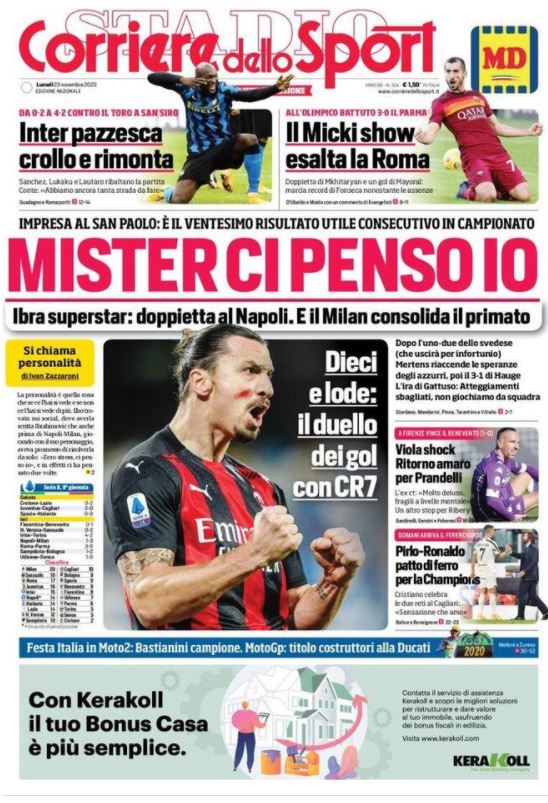 Il Corriere dello Sport oggi in edicola apre in prima pagina con Zlatan Ibrahimovic ed il titolo: "Mister ci penso io!". Ventesimo risultato utile consecutivo in campionato per il Milan, trascinato da una doppietta dello svedese. Dopo l'uno-due di Ibrahimovic, Mertens riaccende le speranza, ma nel finale ci pensa Hauge a rimettere in ghiaccio la partita. Apprensione per Ibra, uscito nel finale per un problema muscolare: entità da valutare nelle prossime ore.