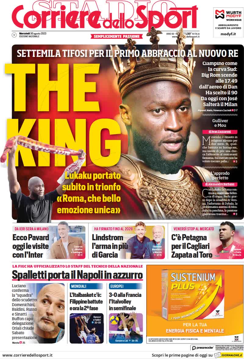 "The king". Viene definito così Romelu Lukaku, dopo l'accoglienza riservata dai tifosi della Roma, in prima pagina su Il Corriere dello Sport stamane: l'attaccante belga è arrivato ieri pomeriggio all'aeroporto di Ciampino sommerso da una folla di settemila sostenitori giallorossi in delirio per il colpo della proprietà Friedkin. Lukaku, che oggi si unirà al gruppo di Mourinho a Trigoria, non dovrebbe giocare venerdì contro il Milan.