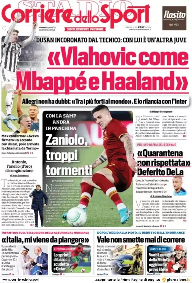 L'edizione odierna del Corriere dello Sport dedica spazio questa mattina anche al Milan ed in particolare a Rafael Leao: "Lo sprint di Leao: scudetto e Qatar" è il titolo del quotidiano romano. Il portoghese è certamente uno dei protagonisti nella stagione rossonera e vuole confermarsi anche in questo finale di campionato, trascinando il Diavolo verso il titolo. Il giovane attaccante spera poi di ritagliarsi un ruolo importante anche nel Portogallo in vista dei prossimi Mondiali in Qatar.