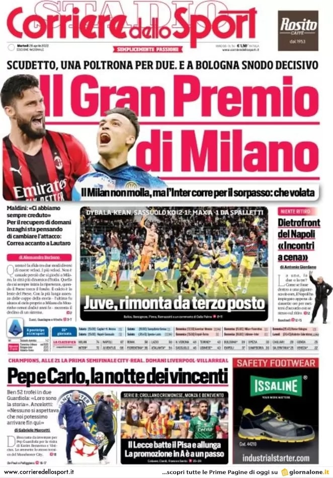 "Il Gran Premio di Milano" titola in apertura l'edizione odierna del Corriere dello Sport. La lotta scudetto è ormai una lotta a due tra Milan e Inter. Domani i nerazzurri recupereranno la gara in meno contro il Bologna, partita che fungerà da snodo decisivo per la situazione in classifica. Al momento il Milan sembra non voler mollare, ma l'Inter crede nel sorpasso.