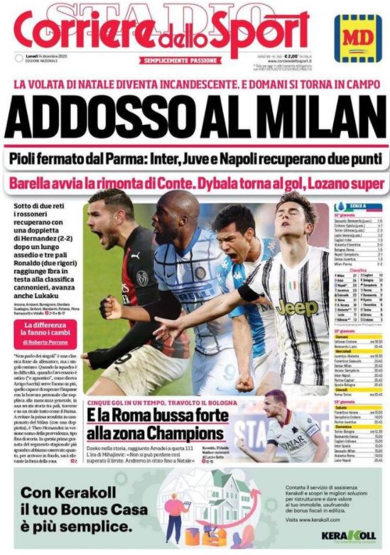 L'edizione odierna del Corriere dello Sport apre in prima pagina titolando: "Addosso al Milan!". I rossoneri sono stati fermati ieri sera dal Parma, con i crociati capaci di andare avanti per due reti a zero, salvo venire recuperati in pieno recupero da Theo Hernandez. Inter, Juventus e Napoli recuperano così due punti alla banda di Pioli, rendendo infuocata la volata di Natale. I nerazzurri vincono in rimonta soffrendo non poco a Cagliari, mentre la Juventus supera il Genoa grazie al ritorno al gol di Dybala e alla doppietta su rigore di Cristiano Ronaldo, che raggiunge Ibrahimovic in vetta alla classifica marcatori. Rimonta anche per il Napoli sulla Sampdoria, con le reti dalla panchina di Lozano e Petagna.