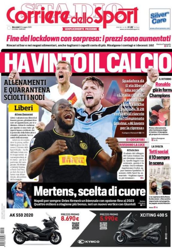 "Ha vinto il calcio" è il titolo d'apertura del Corriere dello Sport in edicola oggi. Un 'urlo' liberatorio per un primo segnale di ritorno alla normalità. Allenamenti e quarantena: sciolti i nodi. Spadafora dà il via libera alla Serie A: "L'Italia riparte, è giusto che riparta anche il pallone". Il 28 maggio vertice sul riavvio del campionato. Gravina: "Al lavoro per la ripresa".
