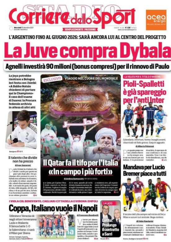 In vista di Milan-Napoli di domenica sera a San Siro, l'edizione odierna del Corriere dello Sport titola così stamattina in prima pagina: "Pioli-Spalletti è già spareggio per l'anti-Inter". La squadra di Inzaghi è davanti a tutti, dietro rossoneri e azzurri sono con il fiato grosso anche a causa dei tanti infortuni. Alle loro spalle in classifica c'è l'Atalanta che è in agguato e pronta a sfruttare anche lei i loro passi falsi.