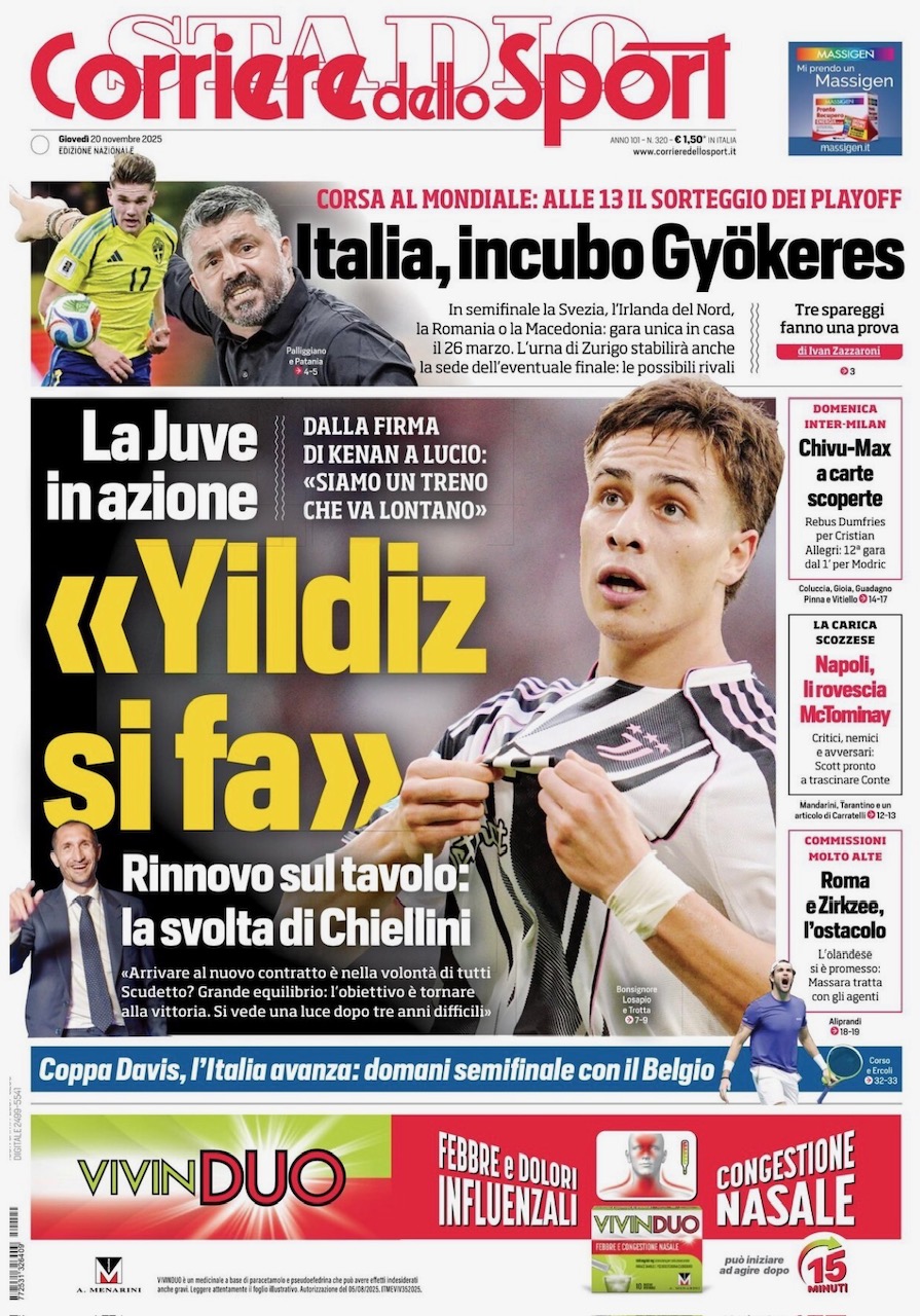 Il Corriere dello Sport in edicola stamattina titola così in prima pagina su Inter-Milan: "Chivu-Max a carte scoperte". I nazionali delle due squadre sono quasi tutti rientrati e così Cristian Chivu e Massimiliano Allegri hanno iniziato a preparare il derby di domenica sera. In casa nerazzurro è sempre in dubbio la presenza di Denzel Dumfries, tornato prima dagli impegni dell'Olanda per un problema alla caviglia (non si è allenato in gruppo negli ultimi giorni).