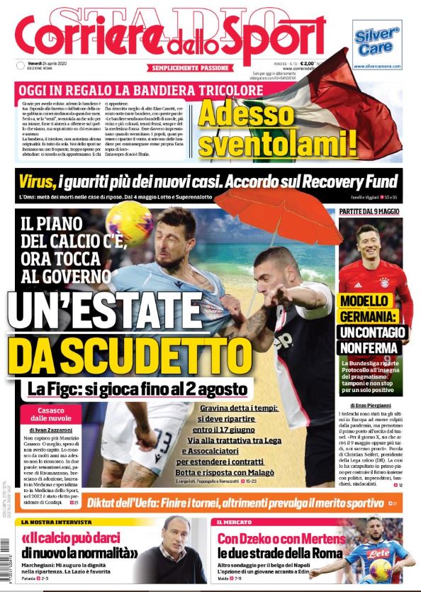 "Un'estate da Scudetto": questo il titolo d'apertura del Corriere dello Sport in edicola quest'oggi. Il piano del calcio per la ripartenza c'è, ora tocca al Governo. La FIGC annuncia: si gioca fino al 2 agosto. Gravina detta i tempi: si deve ripartire entro il 17 giugno. Via alla trattativa tra Lega e AssoCalciatori per estendere i contratti. Botta e risposta con Malagò. Diktat dell'UEFA: finire i tornei, altrimenti prevalga il merito sportivo.