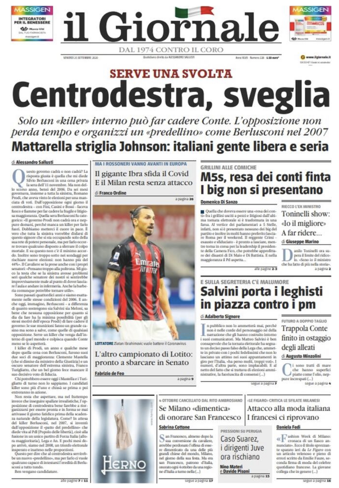 "Il gigante Ibra sfida il Covid: e il Milan resta senza attacco". Questo il titolo che è possibile trovare sulla prima pagina de il Giornale in edicola, in riferimento alla positività al Coronavirus di Zlatan Ibrahimovic annunciata ieri. La positività lo ha costretto a saltare la gara contro il Bodo-Glimt di Europa League. Tutti gli altri tamponi effettuati sul gruppo squadra sono risultati negativi". "Il Covid ha avuto il coraggio di sfidarmi: bad idea, il post su Twitter dello svedese".