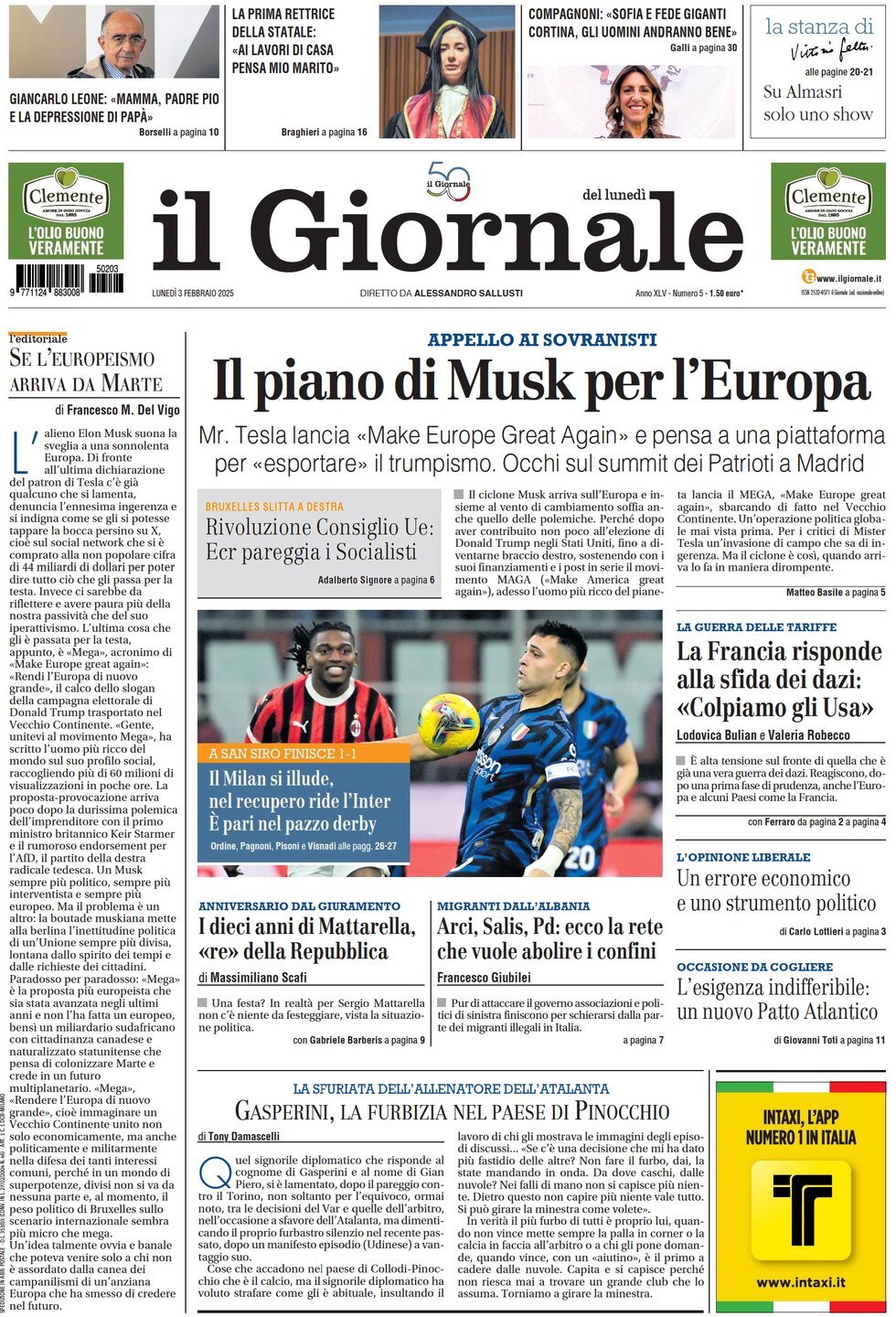 "Il Milan si illude, nel recupero ride l'Inter: è pari nel pazzo derby". Titola così questa mattina Il Giornale, riservando uno spazio importante alla stracittadina milanese in prima pagina. Derby dal sapore olandese, con il Milan che sblocca a un soffio dall'intervallo con Reijnders e l'Inter che pareggia nel recupero con De Vrij. Non cambia nulla in vetta, con il Napoli fermato sull'1-1 dalla Roma.