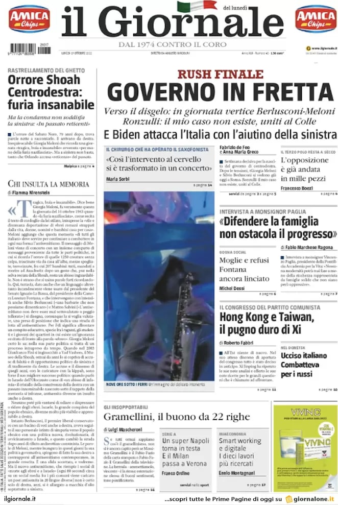 "Un super Napoli torna in testa. E il Milan passa a Verona" scrive Il Giornale sulla Serie A e sulle partite di ieri. Vittoria del Napoli di Spalletti per 3-2 contro il Bologna: azzurri nuovamente primi in classifica, effettuato il sorpasso sull'Atalanta. In serata invece successo per 2-1 da parte del Milan in casa dell'Hellas Verona: decisivo ancora una volta Sandro Tonali.