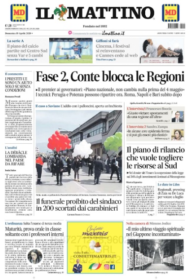C'è spazio anche per lo sport, o meglio, per il calcio sulla prima pagina dell'edizione odierna del quotidiano Il Mattino, che titola in taglio alto: "Il piano del calcio, partite nel Centro Sud senza VAR e 5 cambi". La FIigc ha consegnato ieri il protocollo sulla ripresa delle attività ai ministri Speranza e Spadafora e ora è in attesa che venga giudicato. Fra le possibilità al vaglio anche quella di disputare le gare nel Centro Sud, quindi lontano dalle zone maggiormente colpite dal Coronavirus.