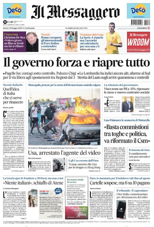 "La Serie A riparte, ma l'accordo sul calendario per ora non c'è". Questo il titolo nel taglio alto della prima pagina del quotidiano Il Messaggero in edicola questa mattina. La Lega - si legge all'interno - conferma la finale di Coppa Italia a Roma il 17, ma per le semifinali non c'è l'accordo. Il via alla Serie A con i 4 recuperi, da lunedì 22 giugno la 27esima giornata di campionato.