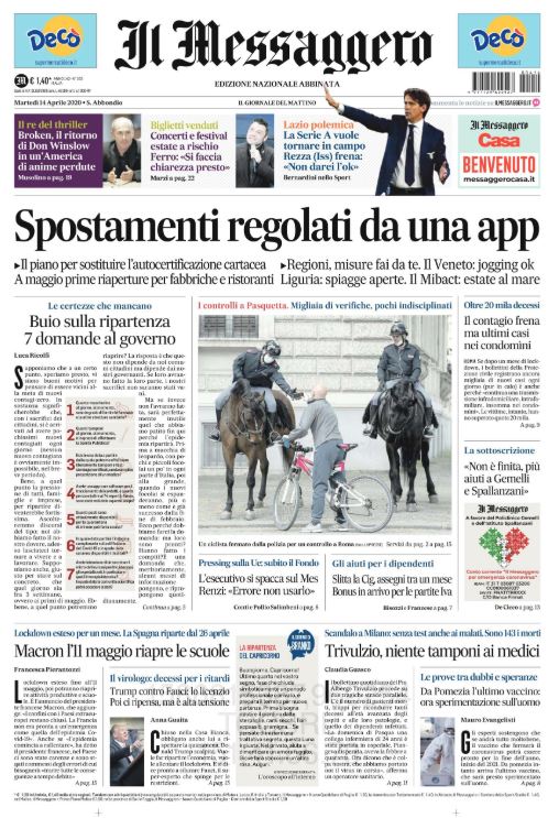 Il quotidiano Il Messaggero in edicola questa mattina dedica uno spazio in prima pagina al nostro campionato con questo titolo: "La Serie A vuole tornare in campo, ma Rezza (ISS) frena". Ennesimo altolà dalle istituzione, stavolta da parte del direttore del dipartimento Malattie infettive dell'ISS, Rezza, che ha dichiarato: "Non darei l'ok per ricominciare". Lazio polemica, la Federazione prova a ripartire: domani ci sarà la riunione della commissione medica per stilare il protocollo di sicurezza.