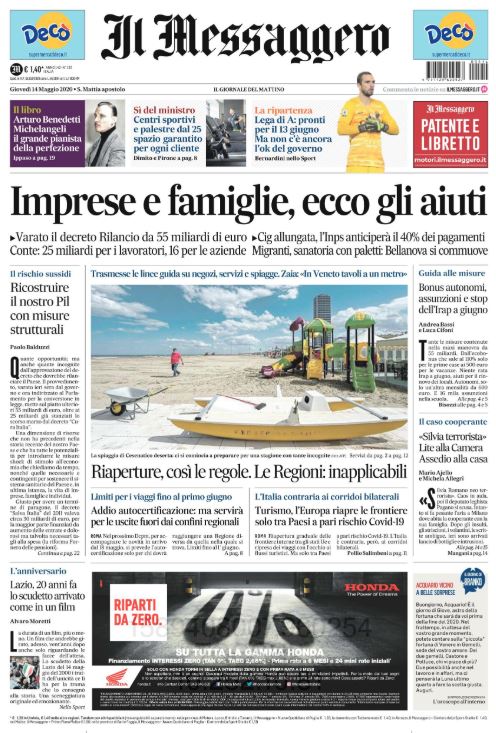 "Lega di A: pronti per il 13 giugno. Ma non c'è ancora l'ok del governo". Questo il titolo che si legge nel taglio alto della prima pagina del quotidiano Il Messaggero in edicola questa mattia. L'assemblea delle società - si legge a pagina 25 - fissa la data di ripresa del campionato se il governo darà il via libera. Decisivo l'incontro tra il premier, Giuseppe Conte, e il presidente della FIGC, Gabriele Gravina.