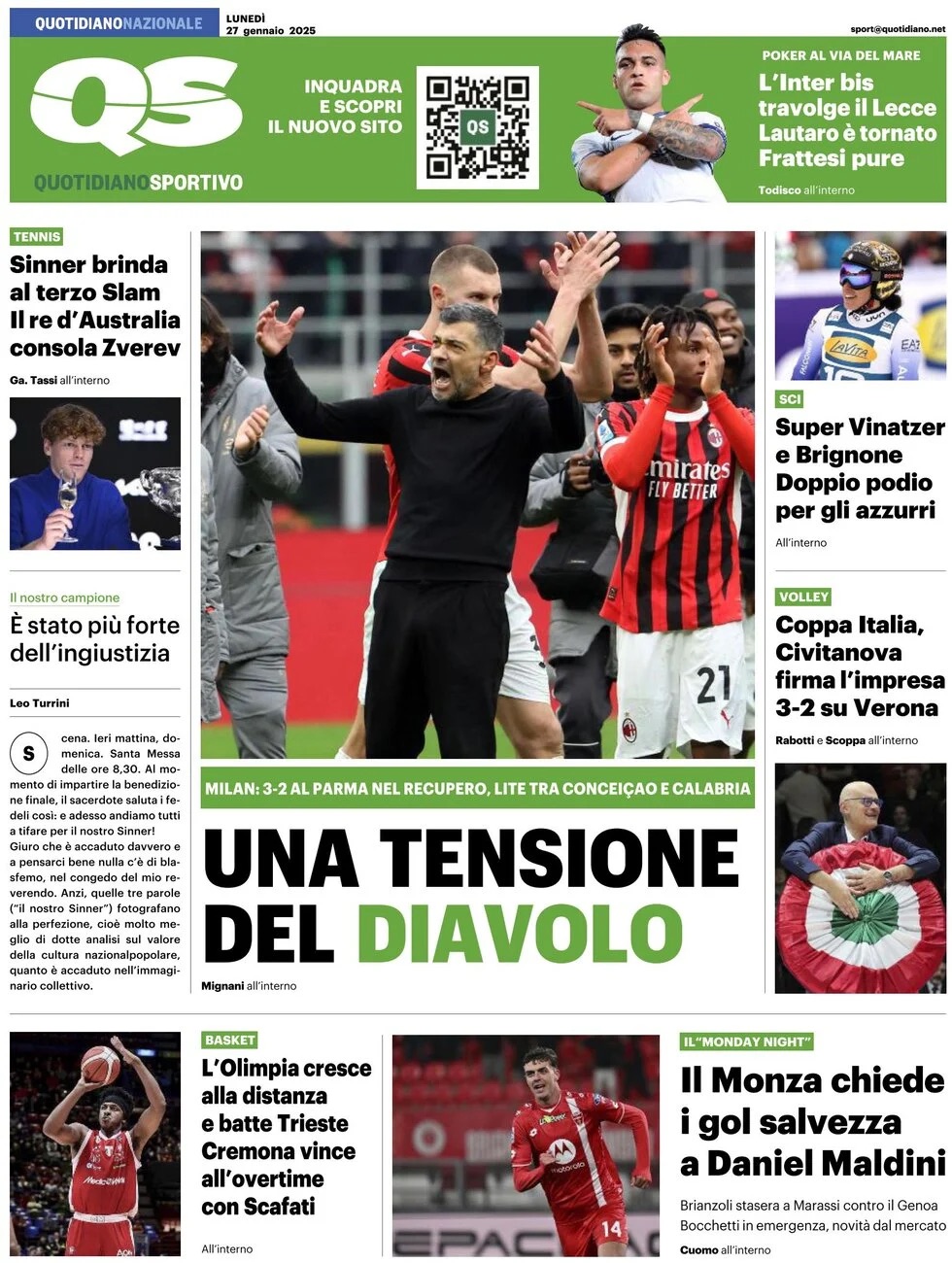 "Una tensione del Diavolo". È così che il Quotidiano Sportivo in prima pagina riassume la clamorosa rimonta del Milan sul Parma nel recupero, avvenuta ieri a San Siro. Nel finale animi bollenti e scintille in particolare tra il tecnico rossonero, Sergio Conceiçao, e Davide Calabria, poi entrambi presentatisi ai microfoni dei media per "chiarire" l'episodio.