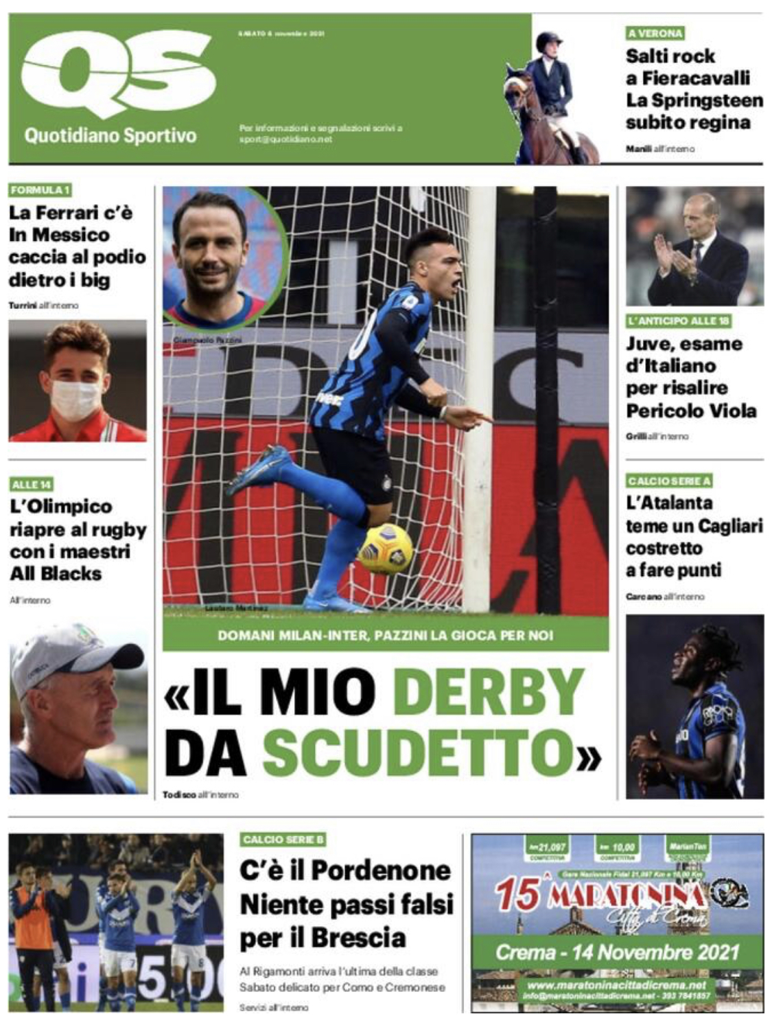 "Il mio derby da scudetto", titola in prima pagina il QS riprendendo le parole di un doppio ex come Giampaolo Pazzini, intervistato per l’occasione proprio dal noto giornale. "Domani Milan-Inter, Pazzini la gioca per noi", scrive il Quotidiano Sportivo in vista della stracittadina di Milano, senza dubbio la gara più attesa della 12esima giornata di Serie A.