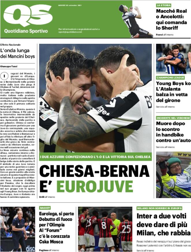 C'è spazio anche per le due milanesi sulla prima pagina dell’edizione odierna del QS. "Inter a due volti, deve dare di più. Milan, che rabbia", titola il Quotidiano Sportivo, che poi aggiunge: "Milano non sorride in Europa. Passo indietro dei nerazzurri sul piano del gioco. Rossoneri polemici con l'arbitro. E Kessie non va".