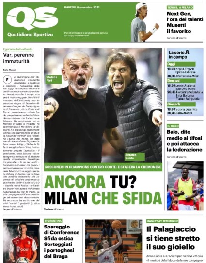 "Ancora tu? Che sfida!", titola stamane QS sul sorteggio di Champions che vede di fronte Milan e Tottenham. I rossoneri di Pioli in Champions League sfideranno gli inglesi di Antonio Conte: un sorteggio che poteva andare molto peggio, ma da non sottovalutare. Però ci sarà tempo per pensare al Tottenham, dopo la sosta: questa sera c'è la Cremonese ed il Milan non può permettersi passi falsi.