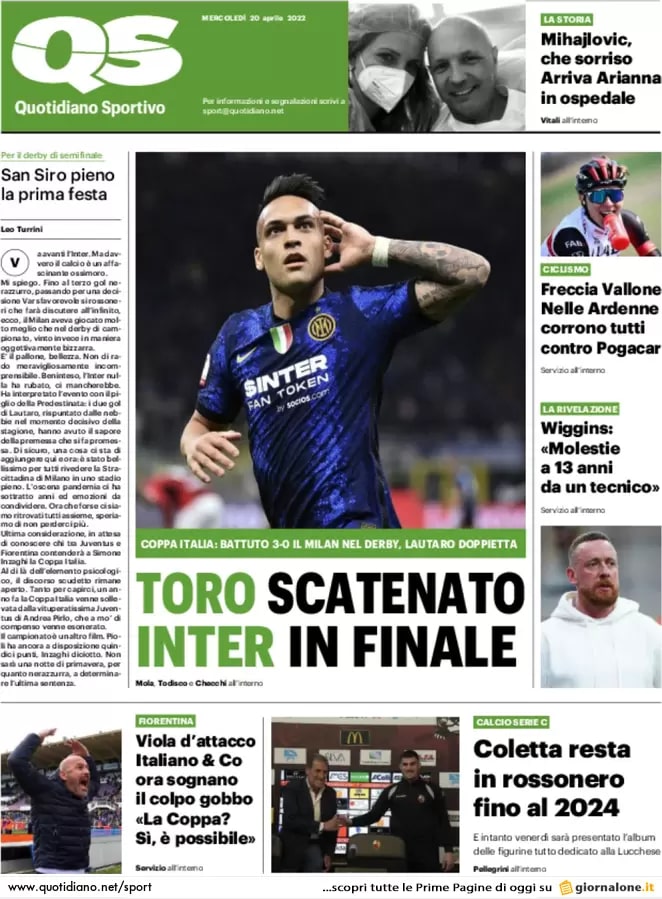 "Toro scatenato, Inter in finale" scrive il QS in apertura sul derby di Coppa Italia che si è consumato ieri a San Siro. Vittoria dell'Inter per 3-0 contro i cugini del Milan. Doppietta di Lautaro Martinez nel primo tempo, rete di Gosens a chiudere i giochi nella ripresa. Grandi proteste dei rossoneri per un gol annullato a Bennacer sul punteggio di 2-0, a mezz'ora dalla fine.