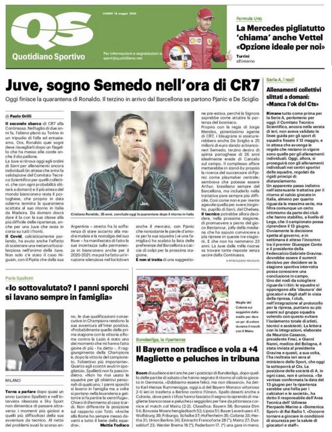 L'edizione odierna del Quotidiano Sportivo titola così questa mattina sulla Serie A: "Allenamenti collettivi slittati a domani: 'Manca l'ok del Cts'". Per il momento, le squadre del massimo campionato italiano non possono riprendere gli allenamenti collettivi in quanto devono attendere l'ok del Governo e del Comitato tecnico scientifico sul nuovo protocollo.