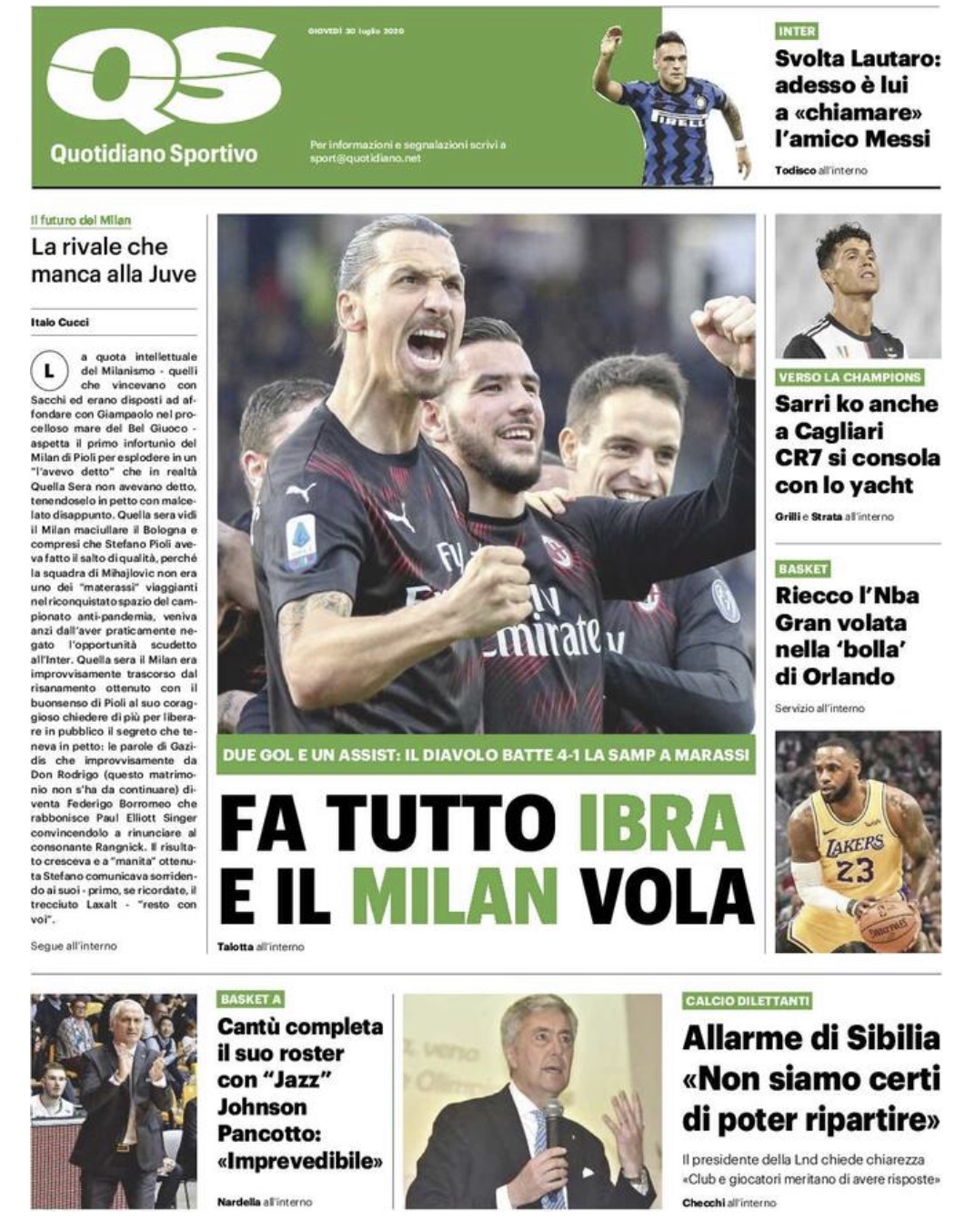 Il QS in edicola questa mattina dedica l’apertura ai rossoneri, o meglio, a Zlatan Ibrahimovic, assoluto protagonista nel successo della squadra di Pioli a Genova. "Fa tutto Ibra. E il Milan vola", titola il Quotidiano Sportivo, che poi aggiunge sempre in prima pagina: "Due gol e un assist: il Diavolo batte 4-1 la Samp a Marassi".
