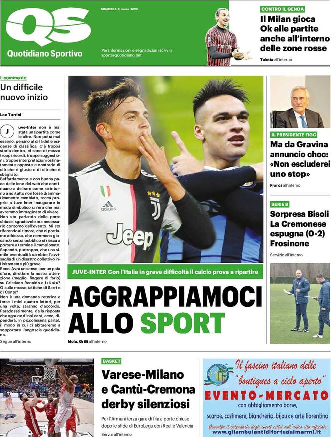 La Serie A va avanti a dispetto dell’emergenza Coronavirus. A San Siro, ad esempio, va in scena una sfida importante per le ambizioni europee dei rossoneri di Pioli. "Il Milan gioca (contro il Genoa)", titola il Quotidiano Sportivo, che poi aggiunge sempre in taglio alto: "Ok alle partite anche all’interno delle zone rosse".