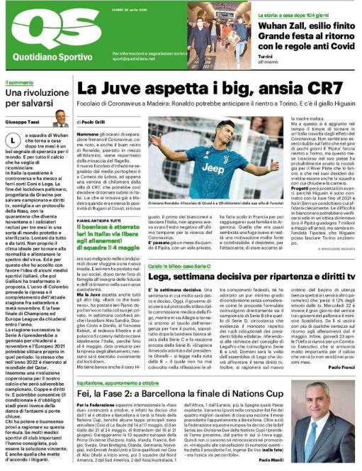 L'edizione odierna del Quotidiano Sportivo titola così questa mattina in prima pagina: "Lega, settimana decisiva per ripartenza e diritti tv". Quella che inizia oggi sarà una settimana molto importante per il calcio italiano ed in particolare per la ripresa della Serie A: domani è in programma, infatti, l'assemblea di Lega, durante la quale verrà affrontato il tema dei diritti tv, mentre mercoledì ci sarà il tanto atteso vertice tra il governo del pallone e il Ministro dello Sport, Spadafora.