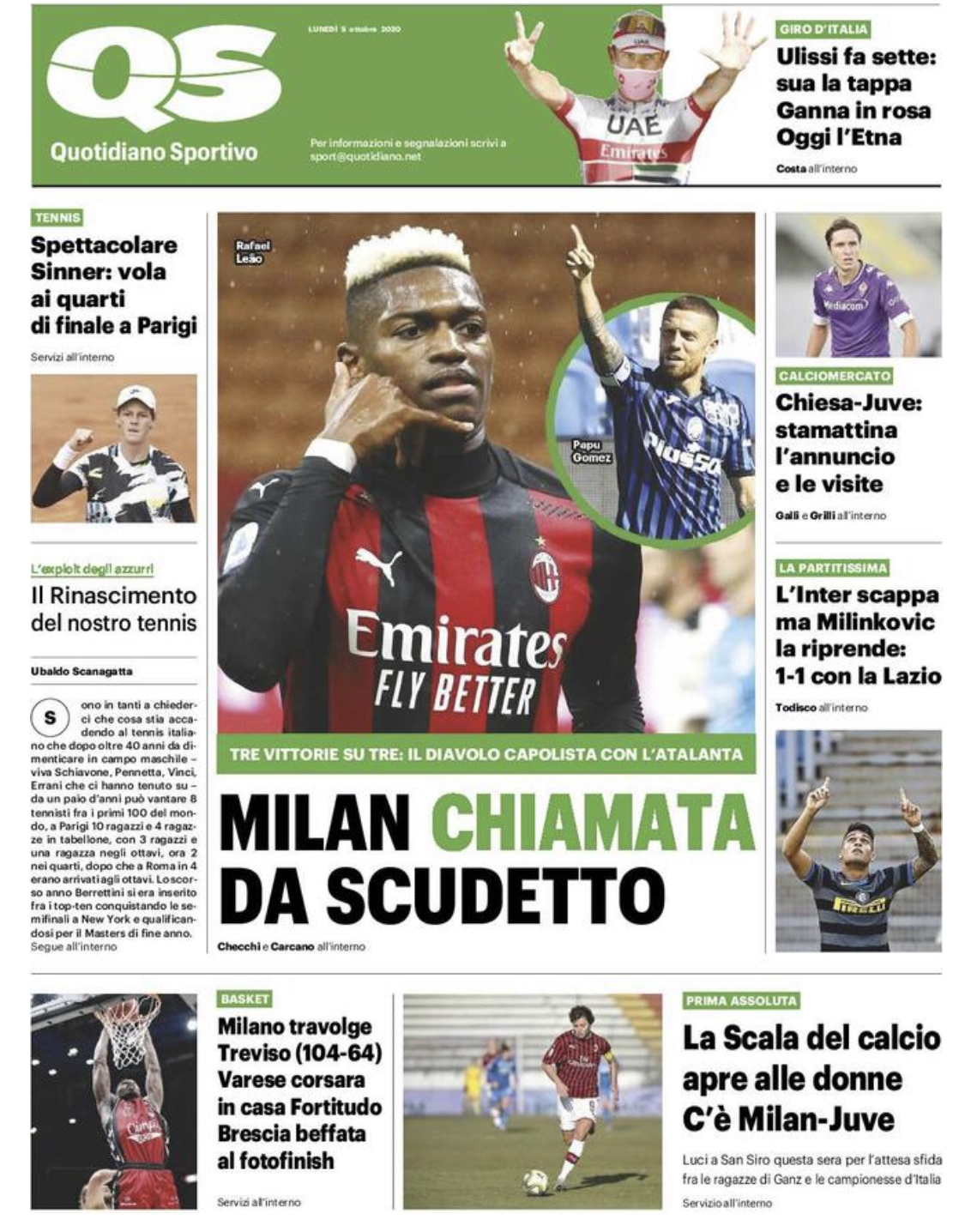 "Milan, chiamata da scudetto". Questo il titolo con cui si apre l'odierna edizione del QS in edicola. Il riferimento va alla vittoria del Milan contro lo Spezia. Un secco 3-0 per i rossoneri che centrano la terza vittoria consecutiva grazie alla doppietta di Leao e al gol del solito Theo Hernandez. Il diavolo adesso si ritrova capolista della Serie A insieme all'Atalanta. Pioli rimane imbattuto da quindici giornate, anche senza Zlatan Ibrahimovic.