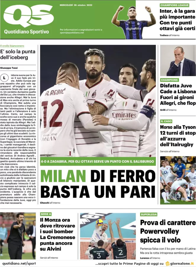 "Milan di ferro, basta un pari", titola stamane in apertura il QS. Goleada rossonera a Zagabria: il 4-0 dei ragazzi di Pioli assicura il sorpasso sul Salisburgo, ora per la qualificazione basta un punto contro gli austriaci.