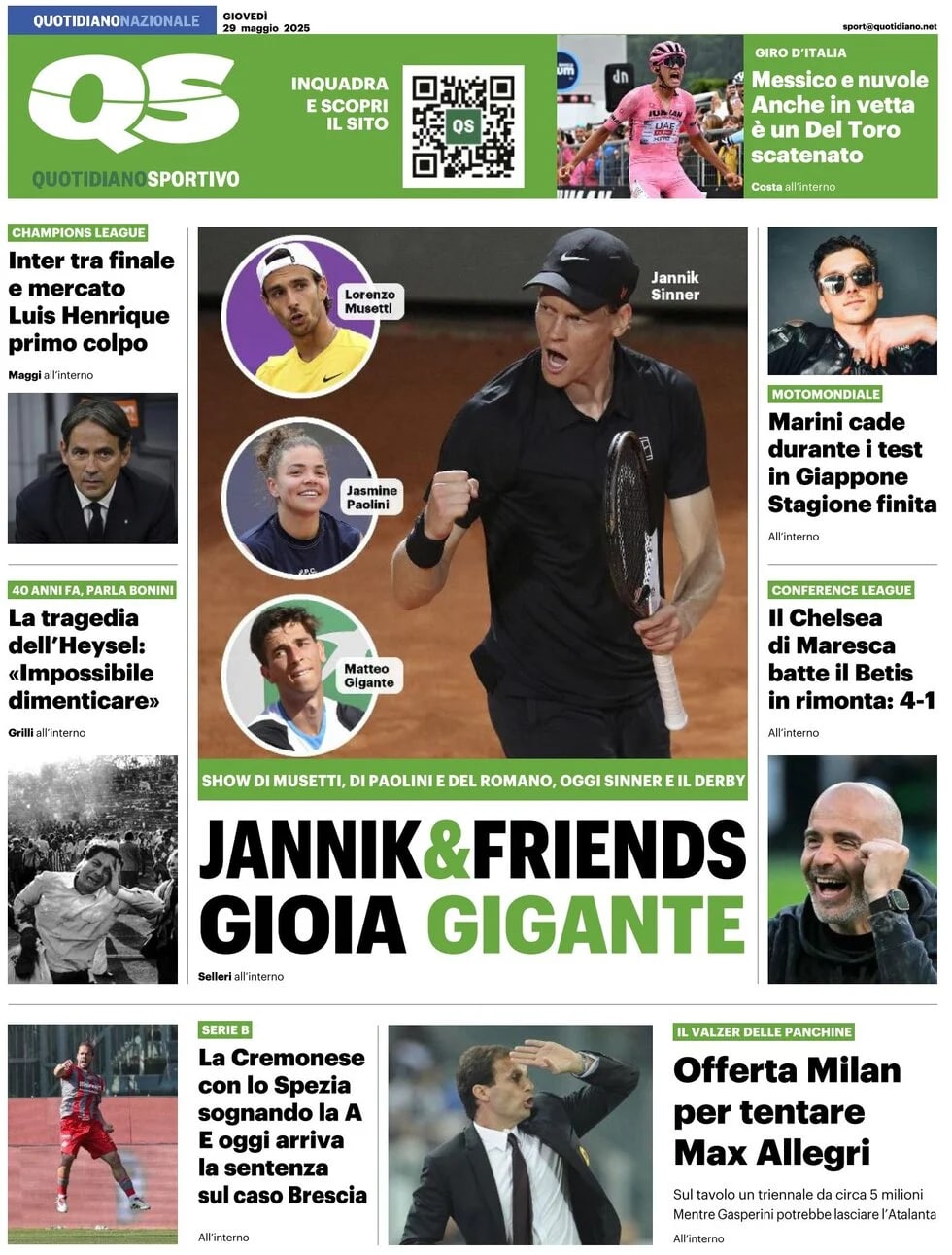 "Offerta Milan per tentare Max Allegri" titola questa mattina il Quotidiano Sportivo. Sul tavolo un contratto triennale da 5 milioni a stagione (si parla di un biennale con opzione per il terzo) per il ritorno di Max in rossonero che sembrava vicino al Napoli ma la probabile permanenza di Conte in azzurro ha cambiato i piani scatenando un nuovo effetto domino. Gasperini potrebbe lasciare l'Atalanta: ci pensa la Roma.
