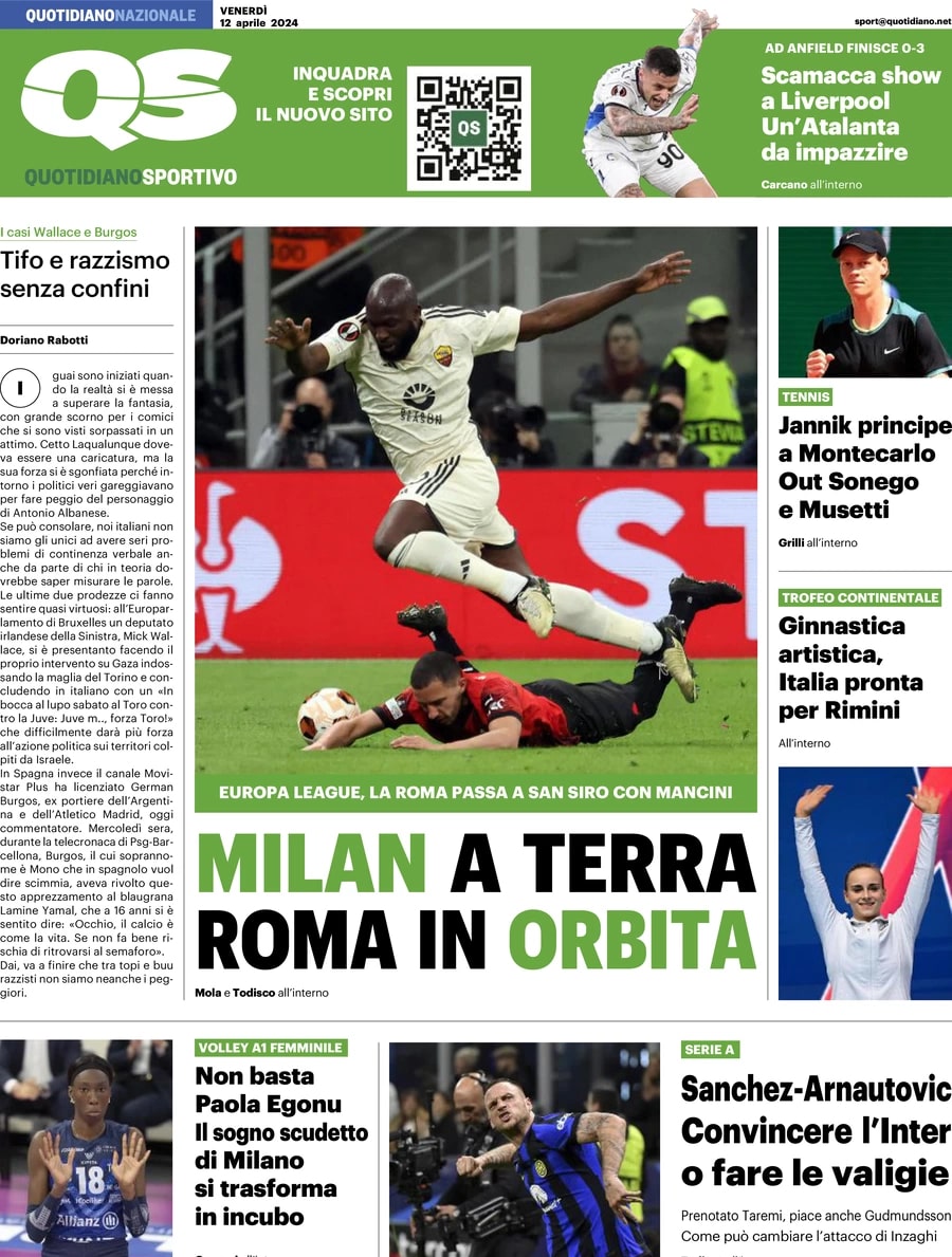 Il QS titola sul derby italiano in Europa League: "Milan a terra, Roma in orbita"